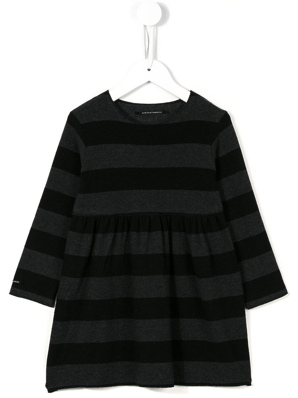 - Album Di Famiglia 灰色与黑色 棉质混纺 条纹针织连衣裙。 圆领, 横条纹, 长袖, 百褶细节, 平直下摆。
