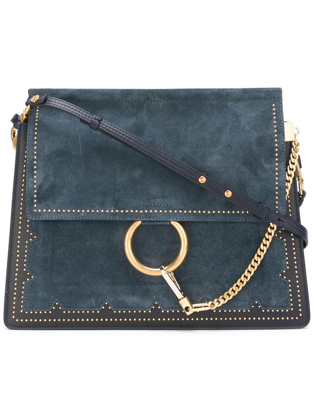 - Chloé (寇依) 蓝色 羚羊皮 'Faye'铆钉单肩包。 翻盖饰有插入式的摁扣, 金色铆钉, 正面饰有浮雕品牌标记, 金色五金配件, 可拆卸可调肩带, 内置一个可延展的夹层, 内置拉链口袋, 内置浮雕标记。