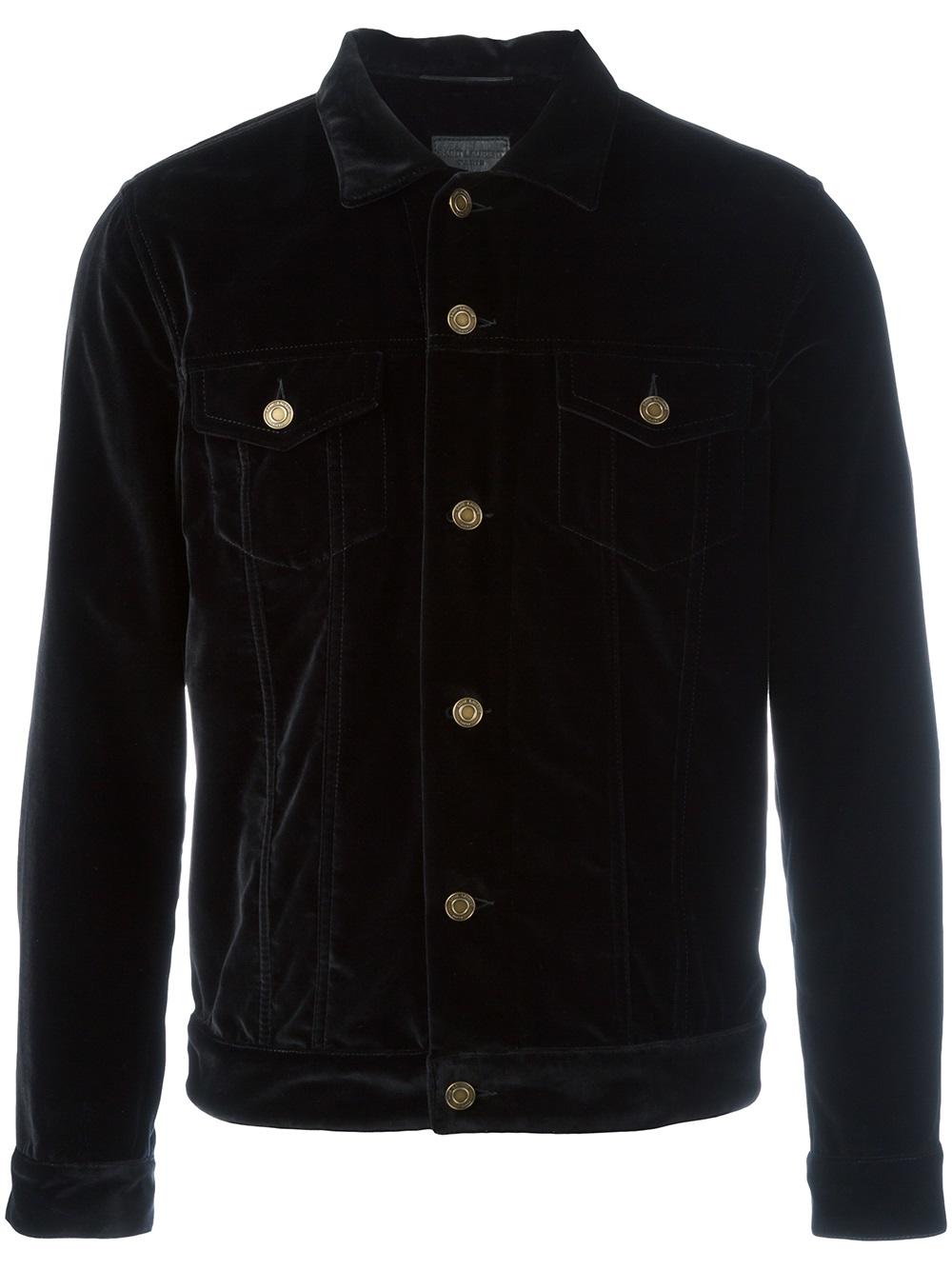 - Black cotton 'Musical' velour jean jacket from Saint Laurent featuring a classic collar, a front button fastening, front flap pockets, long sleeves, button cuffs, silver-tone stud detailing in a musical note design and a straight hem.