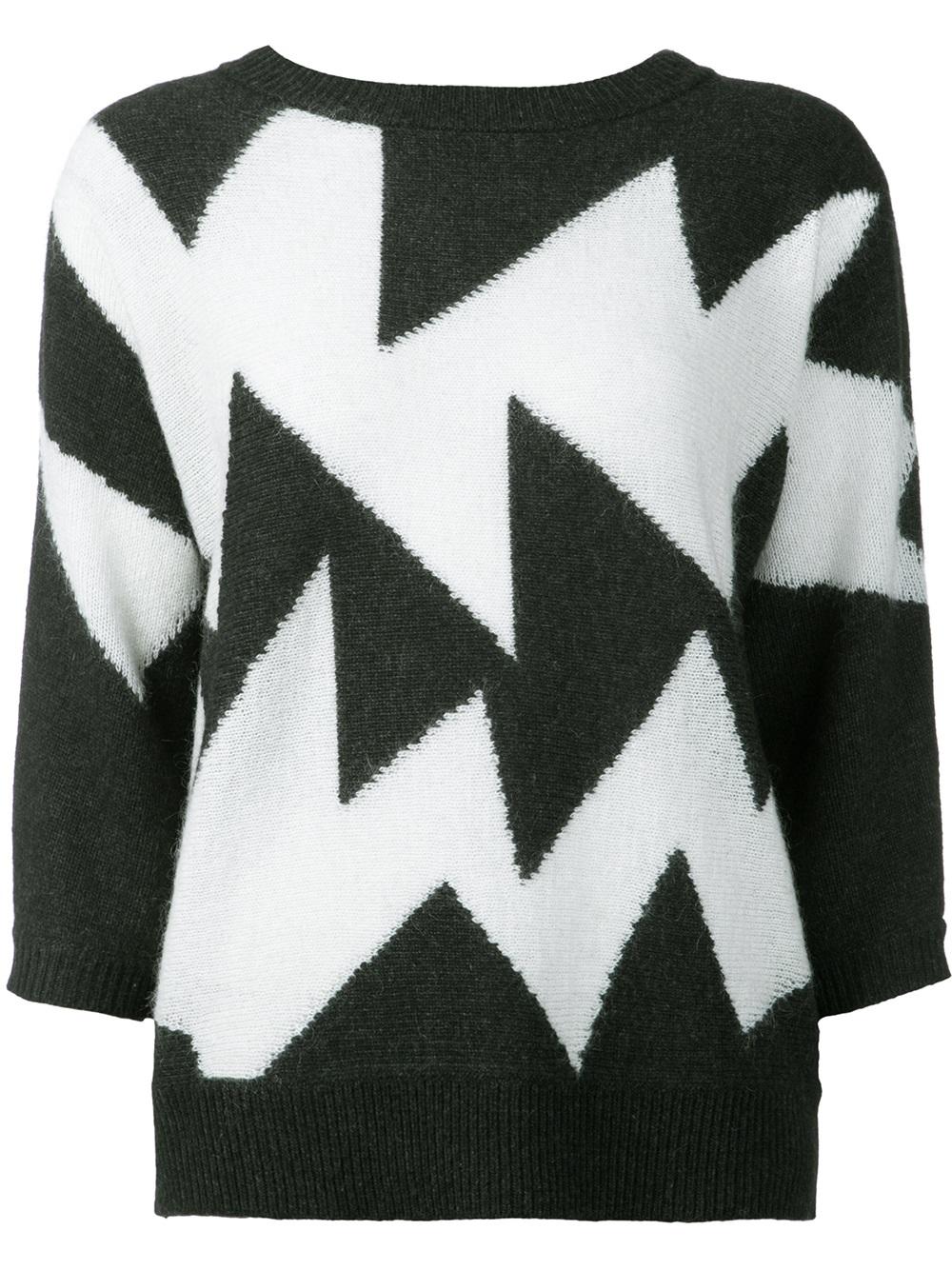 - Black and white lambs wool, cashmere and angora blend geometric intarsia jumper from LEO & SAGE.