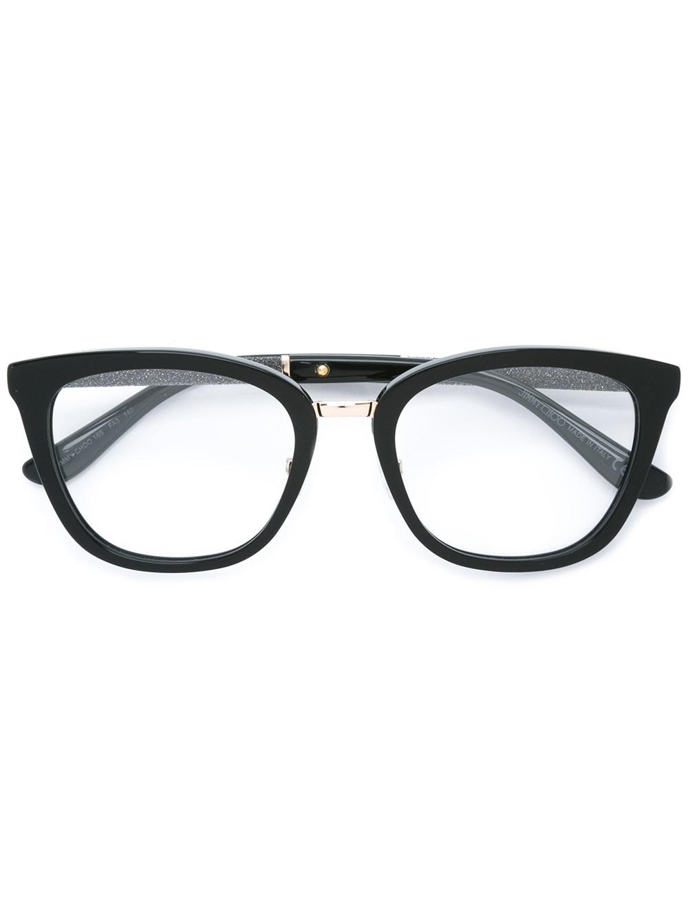 - These black acetate and metal JC165 FA3 unisex glasses from Jimmy Choo feature sleek square frames, a gold-tone curved bridge, a logo decal on the lens and granite effect panelled straight arms with curved tips. The bridge measures 19mm and the lens width is 51mm. These Jimmy Choo glasses can be adapted to fit all types of prescription lenses. They come with a protective case and cloth.