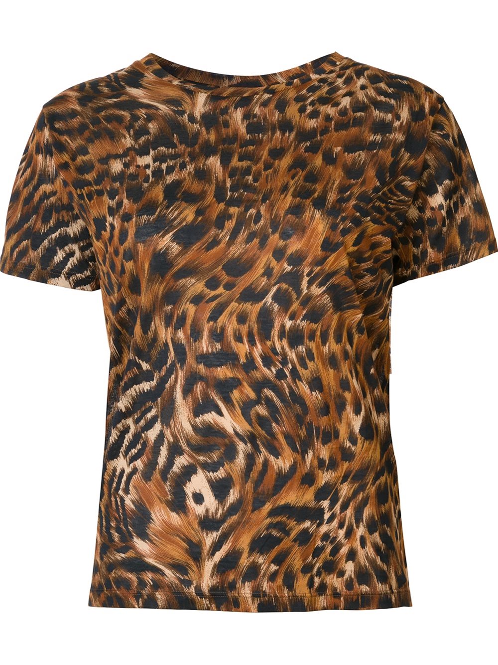 - Saint Laurent (圣罗兰) 褐色 全棉 豹纹羽毛印花T恤。 圆领, 短袖, 大面积花纹, 平直下摆。