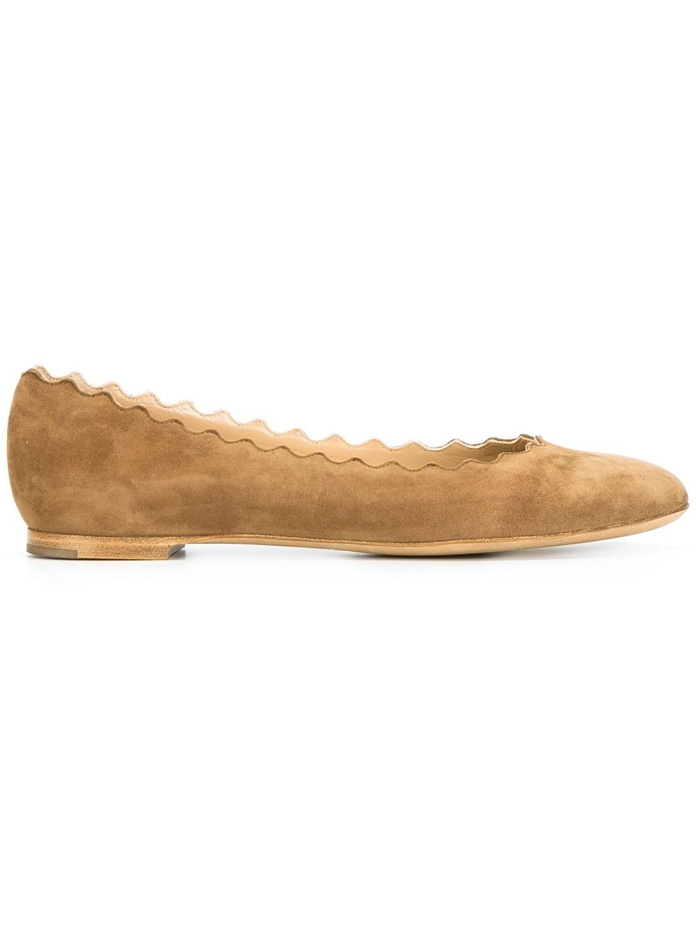 - Chloé (寇依) 暗灰褐色 绒面皮与牛皮 'Lauren'芭蕾舞平底鞋。 杏仁形鞋尖, 扇贝形细节, 鞋垫饰有品牌浮雕, 皮革质鞋垫, 平底。