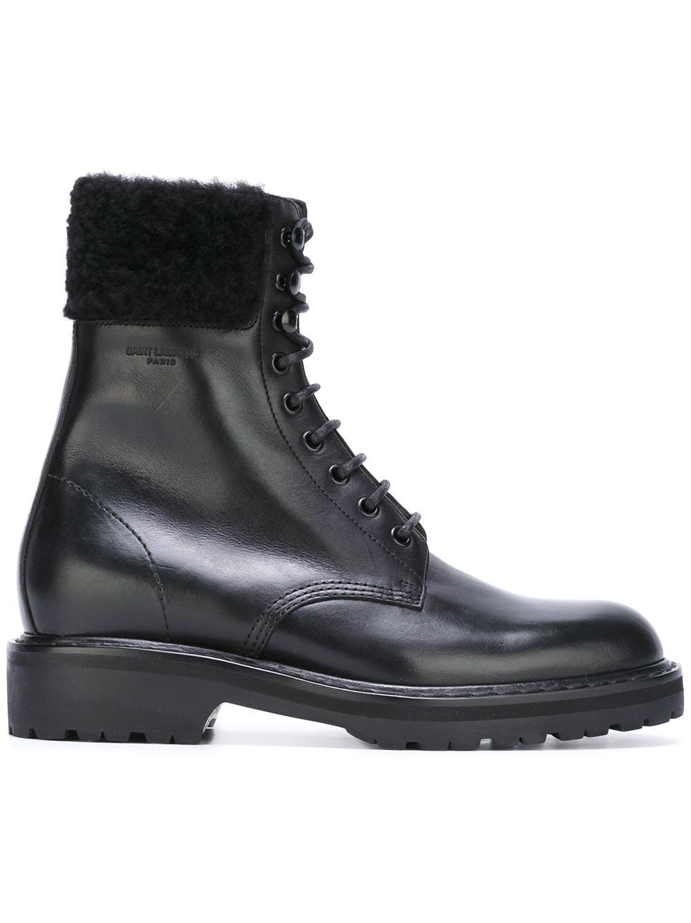 - Saint Laurent (圣罗兰) 黑色 牛皮与羊毛 'Trekker 25'短靴。 杏仁形鞋尖, 正面绑带, 橡胶鞋底。