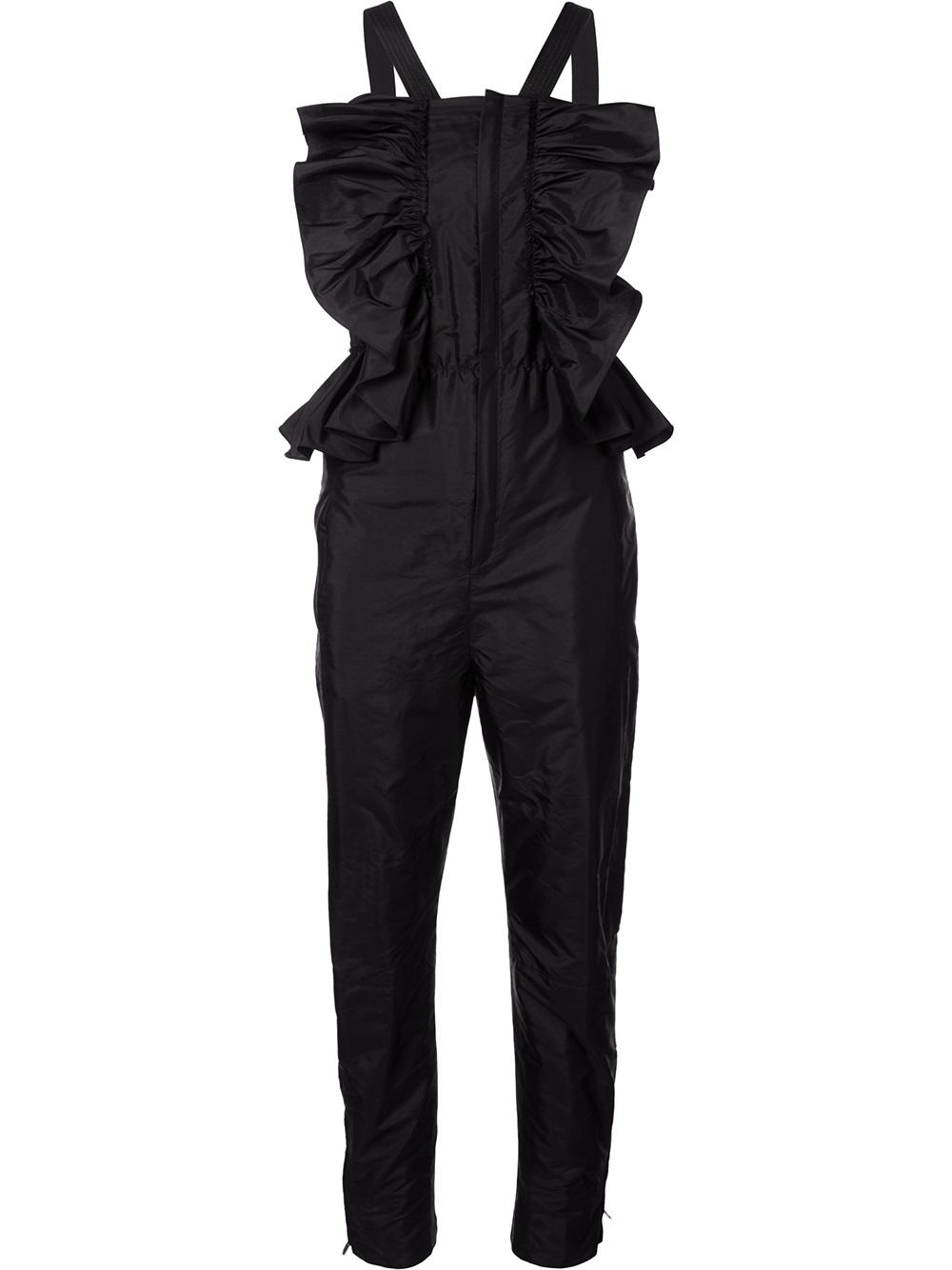 - Black silk ruffled jumpsuit from Chloé featuring shoulder straps, a concealed front fastening, a frill trim, two inset pockets to the sides, a regular length and ankle zips.