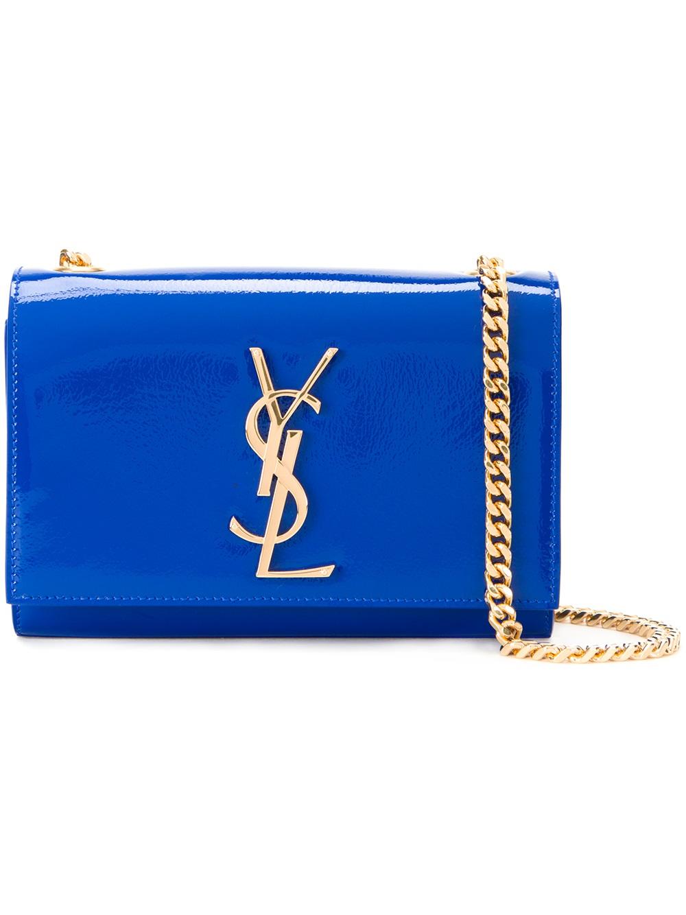 - Majorelle blue patent calf leather small 'Monogram' satchel from Saint Laurent featuring a chain shoulder strap, gold-tone hardware, a front logo plaque, a foldover top with magnetic closure, a suede lining, an internal slip pocket and an internal logo plaque.