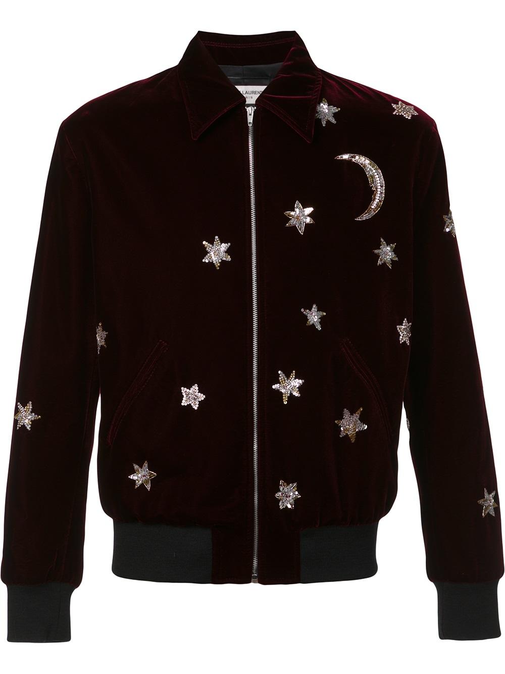 - Saint Laurent (圣罗兰) 深红色 棉质混纺 星月镶嵌飞行员夹克。 经典衣领, 正面拉链, 侧身口袋, 长袖, 罗纹底边及袖口, 亮片刺绣, 全衬里。