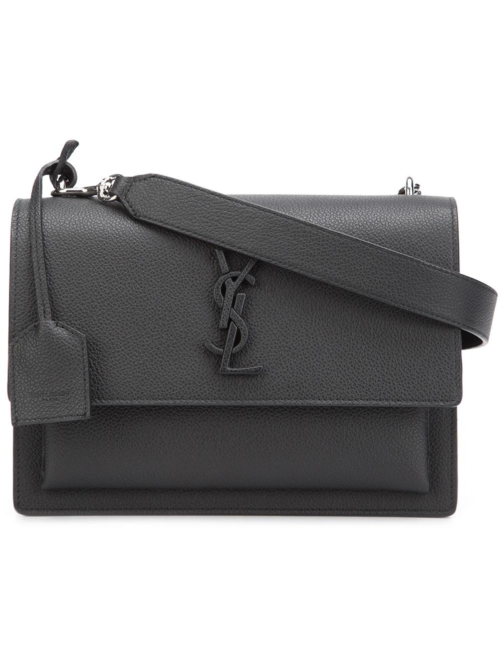 - Black leather small 'Sunset Monogram' satchel from Saint Laurent featuring a detachable shoulder strap, a front logo plaque, a hanging key fob, a back slip pocket, a foldover top with magnetic closure, multiple interior compartments, an internal logo stamp and an internal slip pocket.