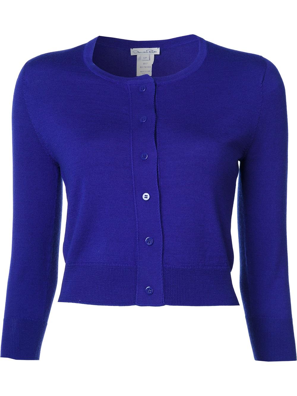 - Blue violet cashmere-silk crew neck cardigan from Oscar de la Renta.