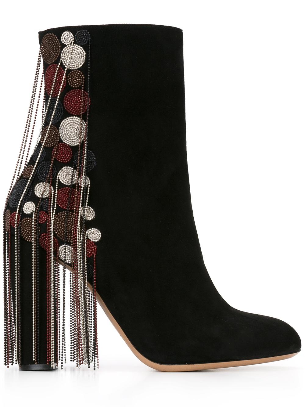 - Chloé (寇依) 黑色 牛皮与小牛皮 'Liv'及踝靴。 杏仁形鞋尖, 珠绣, 流苏细节, 侧置拉链, 高粗跟。