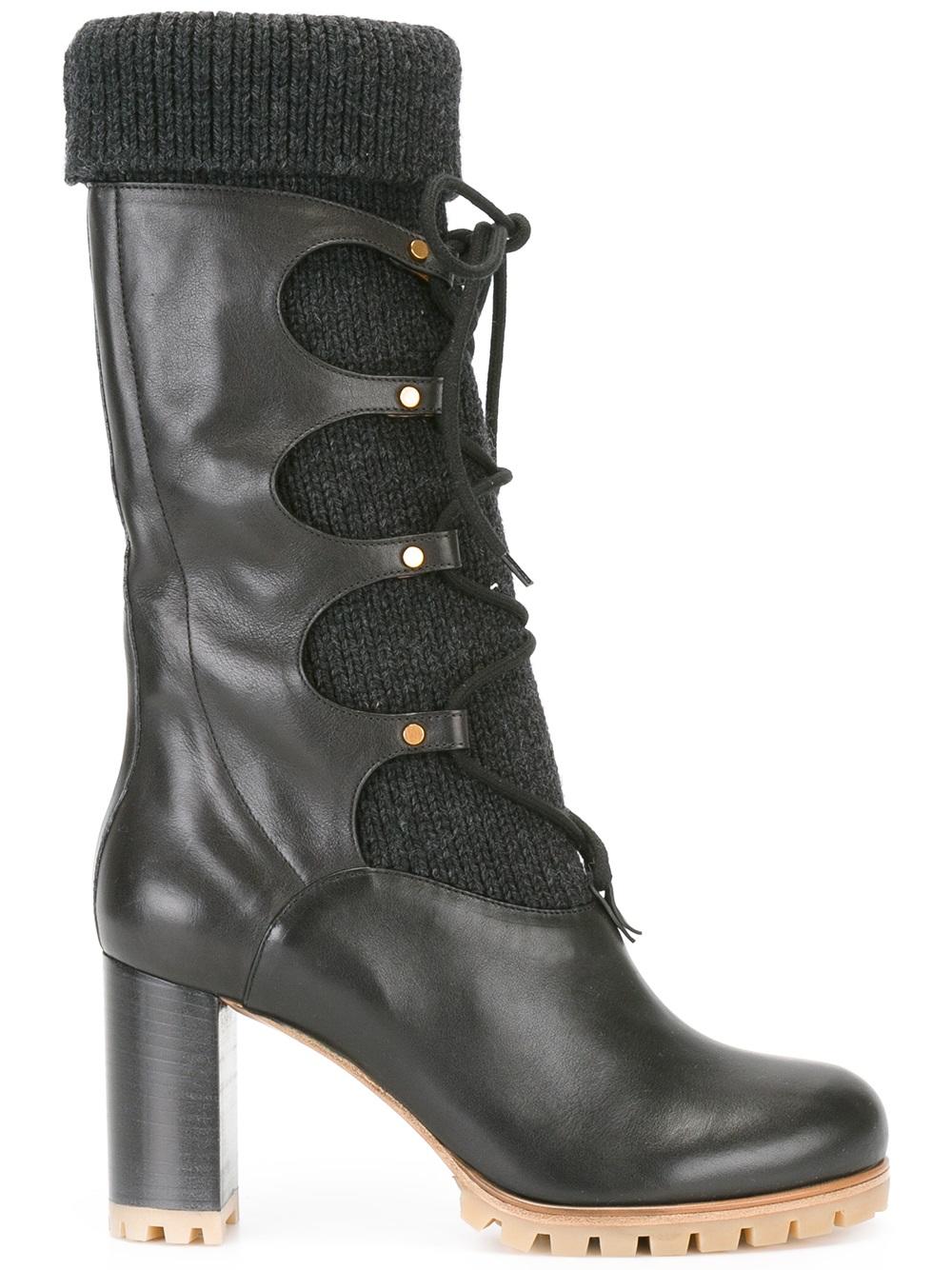 - Chloé (寇依) 黑色 小牛皮牛皮羊毛 'Foster'高筒靴。 杏仁形鞋尖, 罗纹细节, 正面绑带, 橡胶质抓地鞋底。