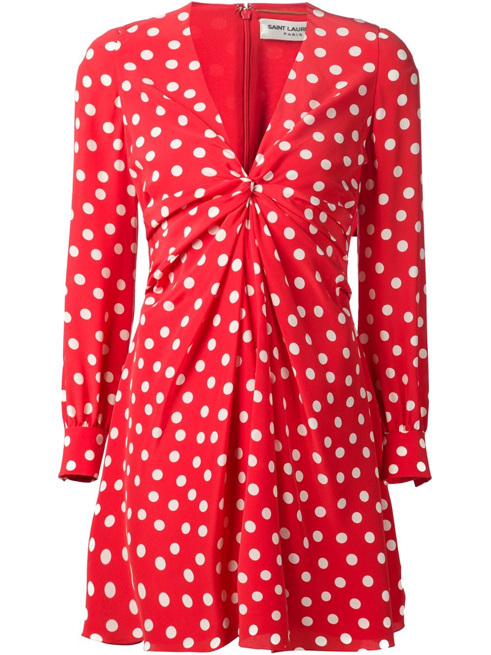 - Saint Laurent 红色及白色 丝绸 圆点连衣裙。 V领, 缩褶细节, 长袖, 搭扣袖口, 束腰, A字形半身裙, 荷叶设计, 平直下摆, 后置拉链。