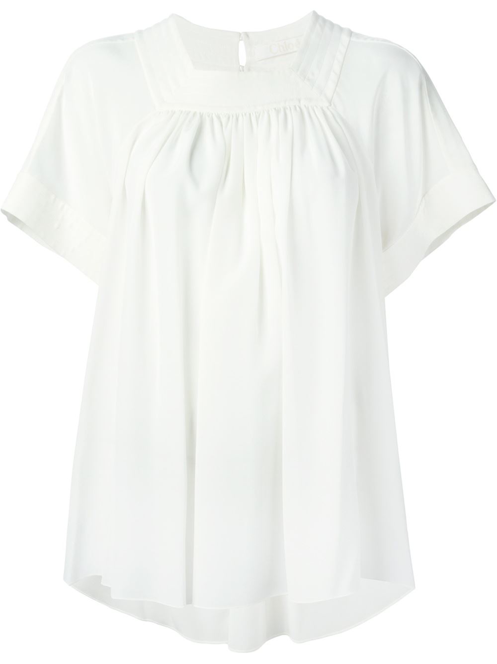 - Chloé 白色 丝绸 垂褶上衣。 方领, 阔短袖, 宽松。