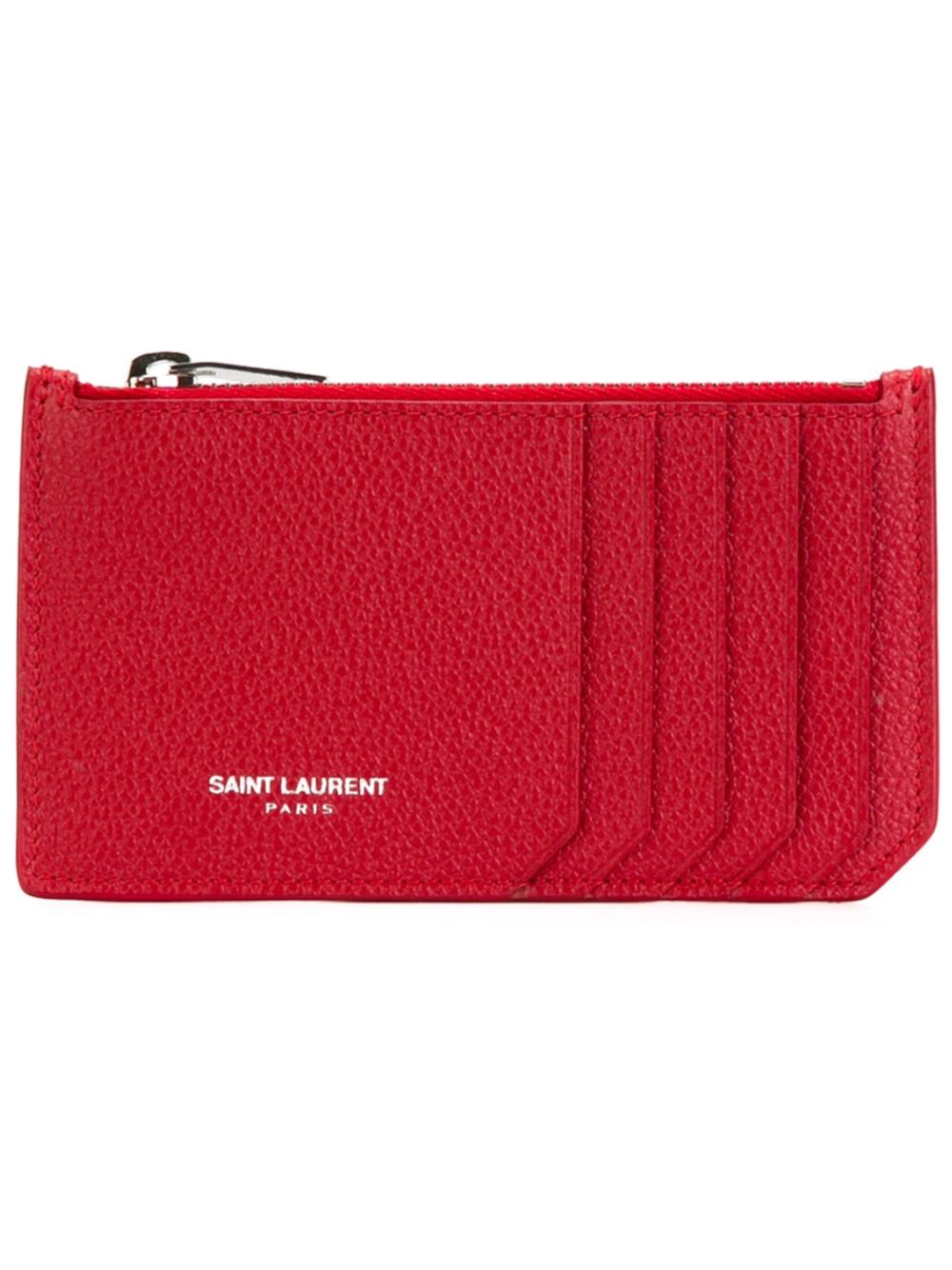 - Saint Laurent 红色 牛皮 'Paris'钱包。 顶部有拉链, 多个夹层, 正面饰有浮雕品牌标记。