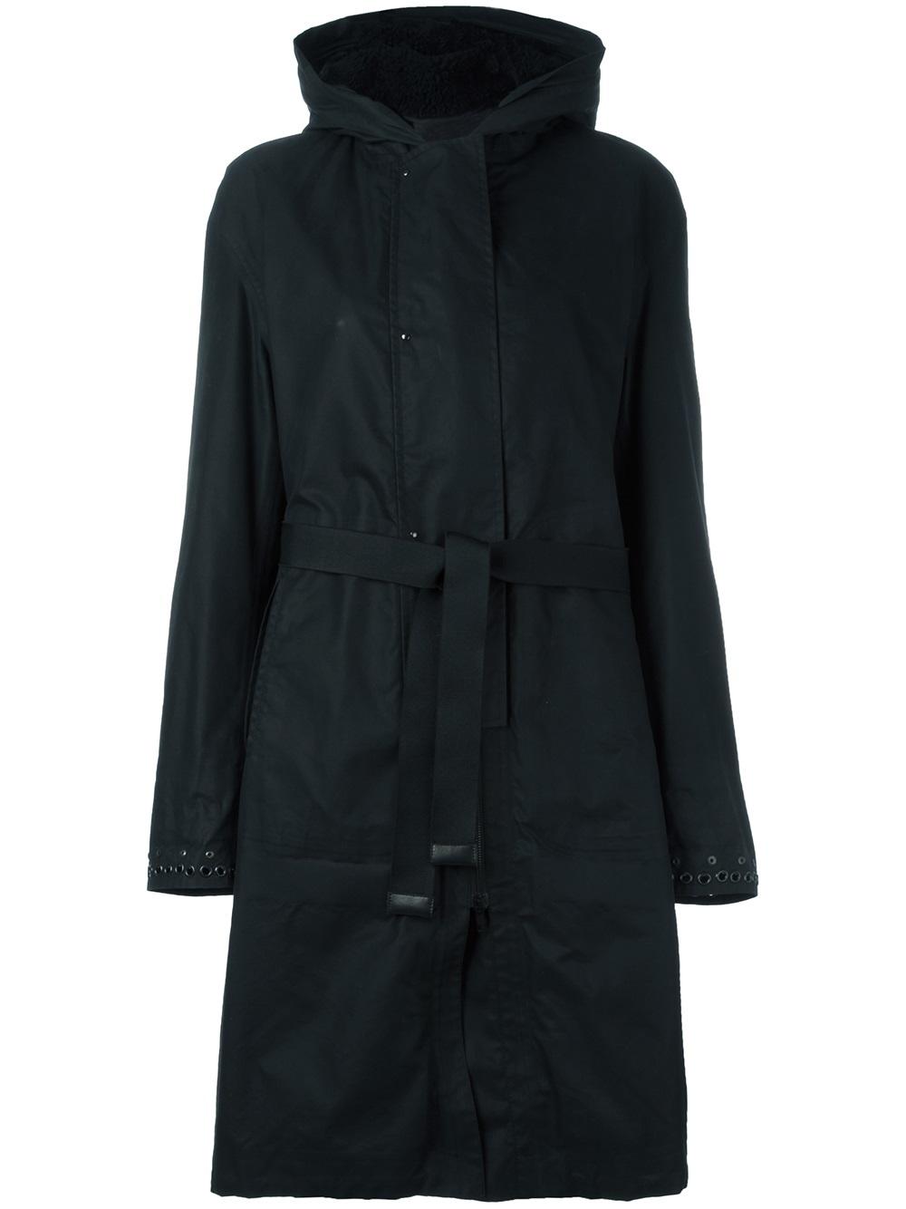 - AHIRAIN 黑色 棉质混纺与小羊皮毛 连帽束腰带外套。