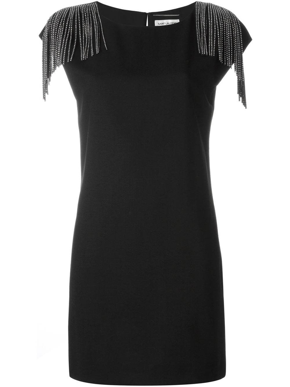 - Saint Laurent 黑色 羊毛与丝绸 流苏直筒连衣裙。 圆领, 侧身口袋, 后面有拉链, 超短袖。