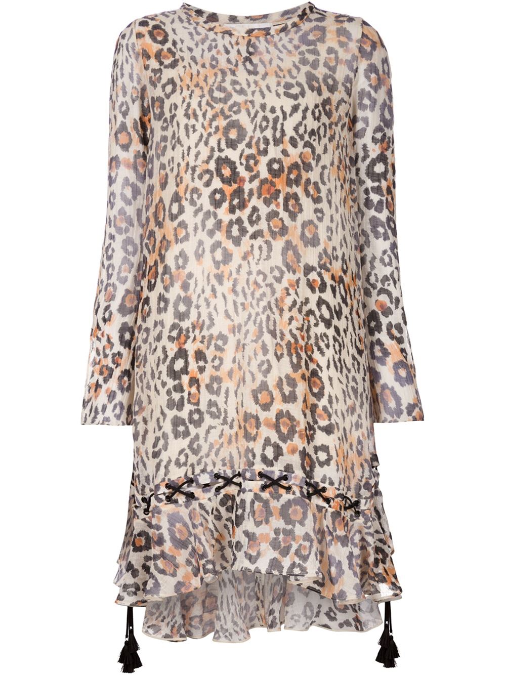 - Chloé 米色与褐色 棉质与亚麻混纺 荷叶边流苏连衣裙。 圆领, 长袖, 手臂部位饰开衩, 宽松, 豹纹, 流苏细节。