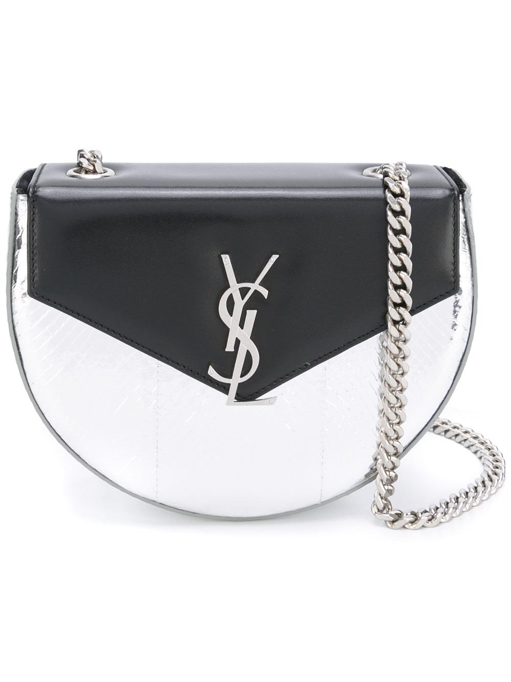 - Saint Laurent (圣罗兰) 黑色与银色 小牛皮 'Demi Lune Monogram'单肩包。 搭链肩带, 银色五金配件, 正面标志贴, 蛇皮效果, 翻盖饰有插入式的摁扣, 绒面皮衬里, 内置贴袋, 内置标牌。