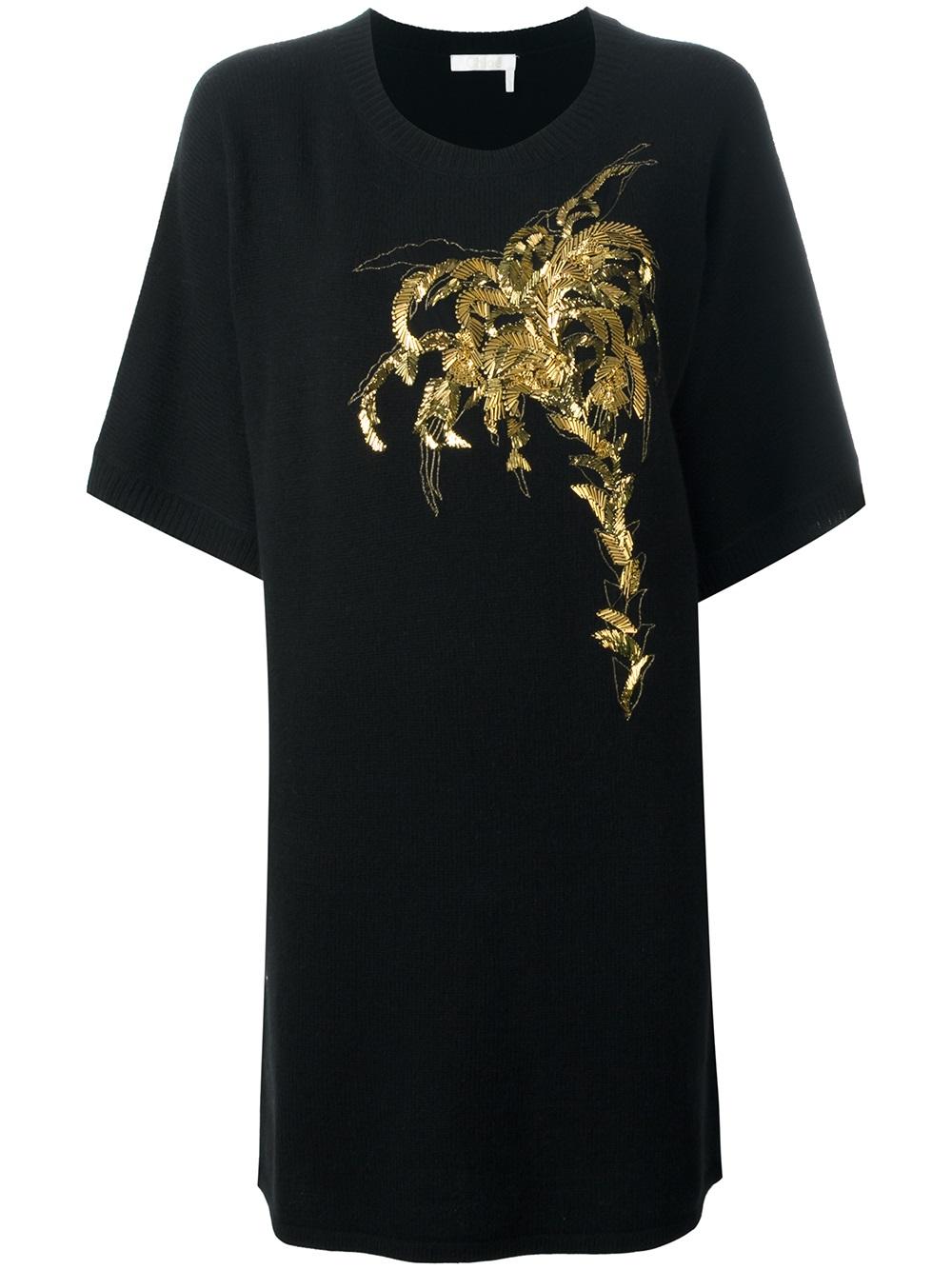 - Black wool-cashmere blend embroidered palm tree dress from Chloé featuring a round neck, beaded embroidery, ribbed trimming, short wide sleeves, a short length and a straight hem.