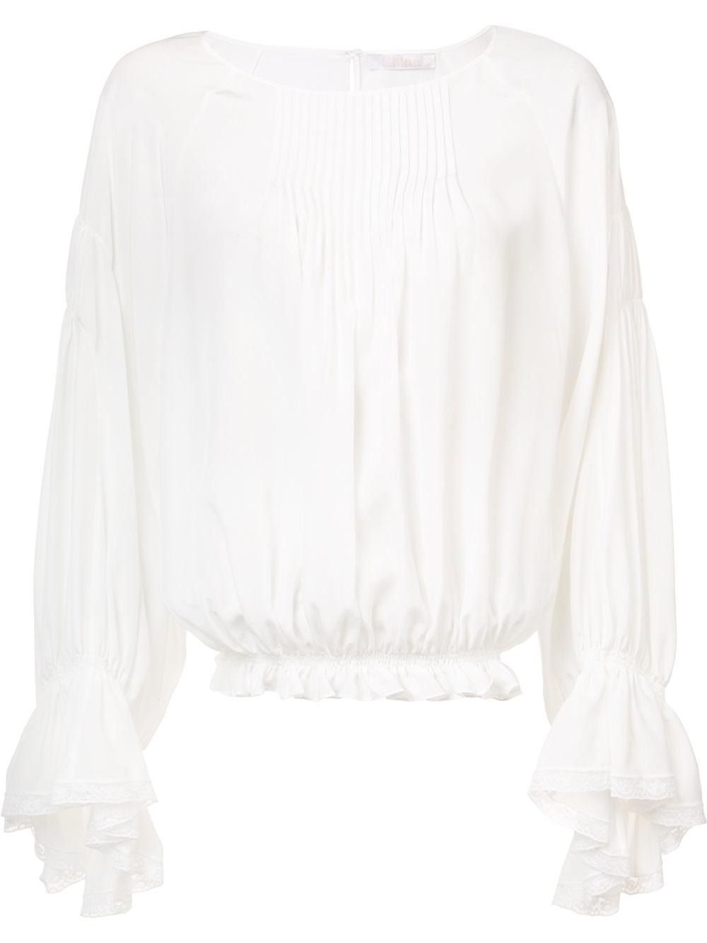 - White silk peasant sleeve top from Chloé featuring a round neck, pleated details, elasticated cuffs, an elasticated hem, a back button fastening, a rear keyhole detail and a lace trim.