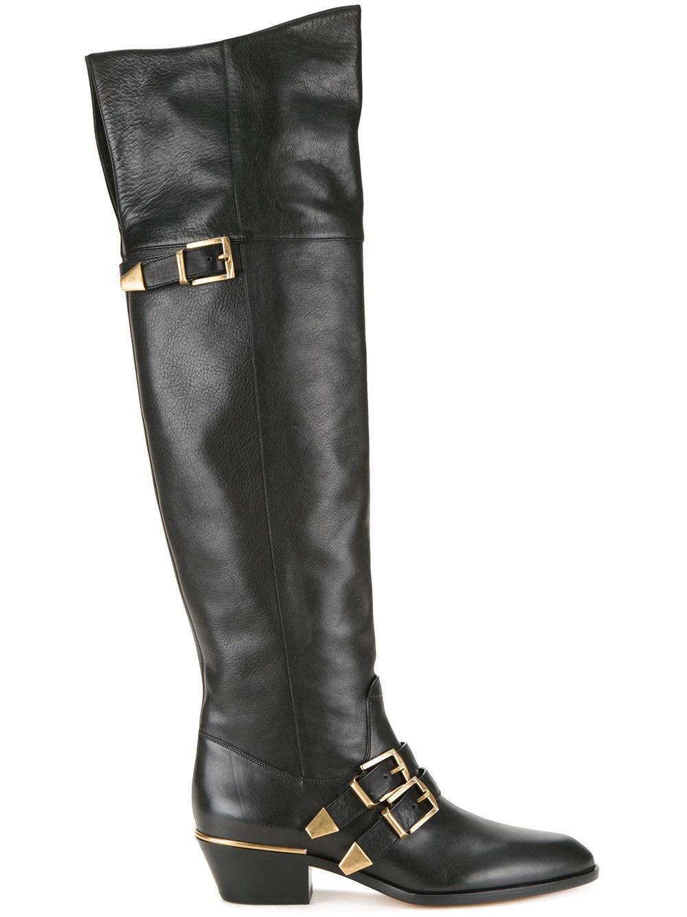 - Chloé (寇依) 黑色 小牛皮 搭扣环扣过膝靴。 杏仁形鞋尖, 金色五金配件, 饰扣子细节, 短粗跟。