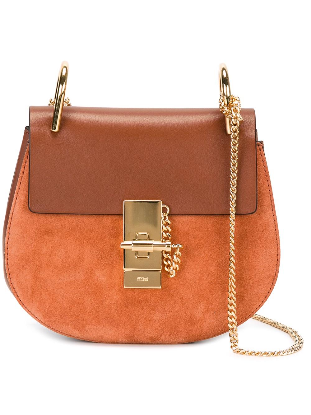 - Classic tobacco brown calf suede and calf leather 'Drew' shoulder bag from Chloé featuring foldover top with twist-lock closure, gold-tone hardware, a front embossed logo stamp, a gold-tone chain shoulder strap, a pouch pocket and a suede lining.