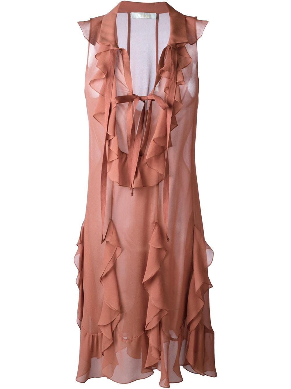 - Chloé 粉色 丝绸 荷叶边无袖连衣裙。 圆领, 蕾丝细节, 宽松设计, 中长。