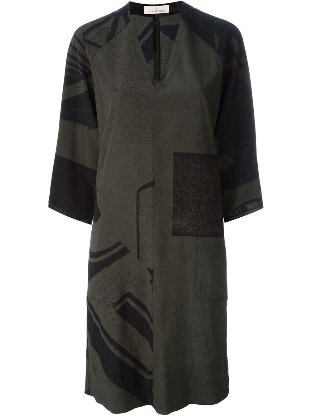 - A.F.Vandevorst 绿色与蓝色 丝绸混纺 '161 Dessert'连衣裙。 V领, 五分袖, 直筒腰, 中长。