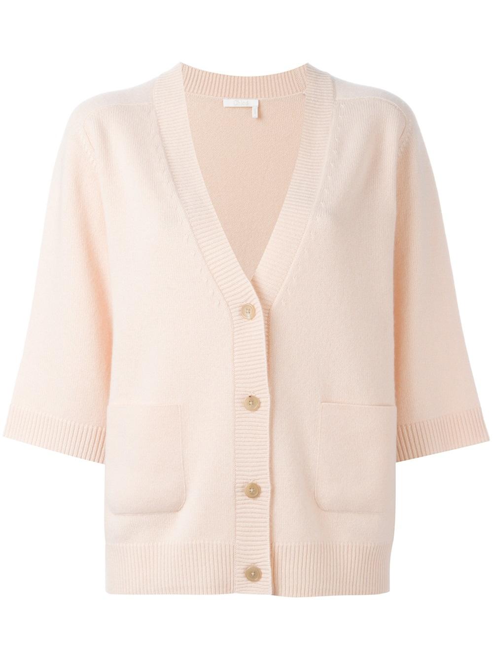 - Pinky beige cashmere v-neck cardigan from Chloé featuring a front button fastening, ribbed trimming, patch pockets, three-quarter length sleeves and a straight hem.