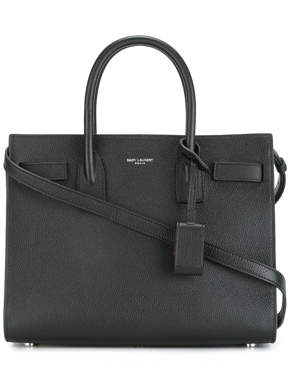 - Black calf leather baby 'Sac de Jour' tote from Saint Laurent featuring round top handles, a detachable and adjustable shoulder strap, silver-tone hardware, a front centre logo stamp, accordion details at sides, an open top design, an internal logo stamp, purse feet, a hanging padlock fob, compression side tabs and a contrasting bordeaux interior.