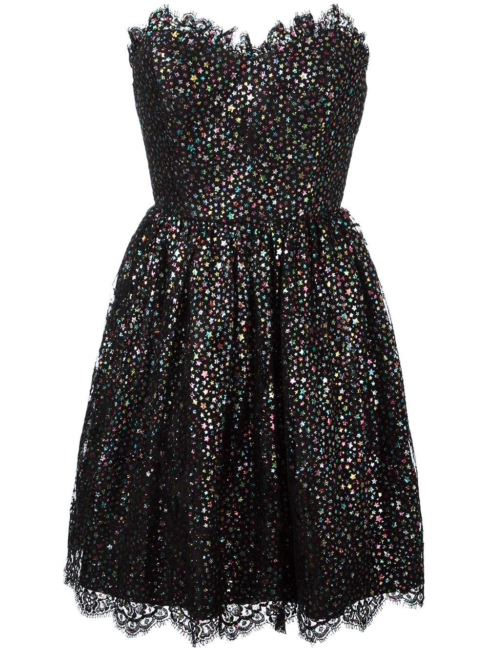 - Black and multicolour silk and cotton blend strapless cocktail dress from Saint Laurent featuring a strapless design, a concealed rear zip fastening, a fitted waist, a scalloped lace hem and bustier trim, a short length and a star print tulle overlay.