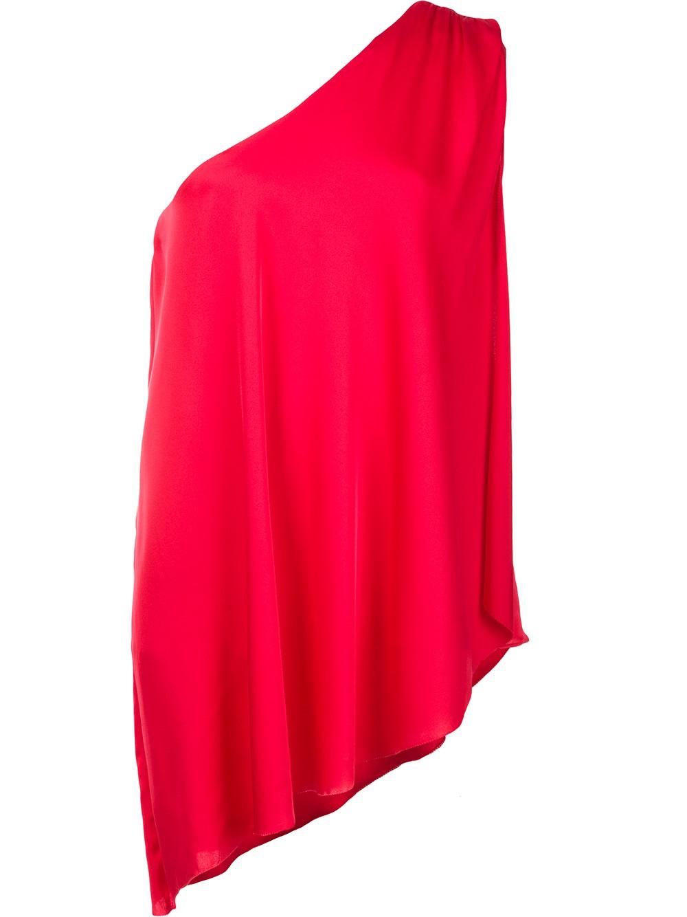 - Ruby red silk blend single shoulder blouse from Trina Turk.