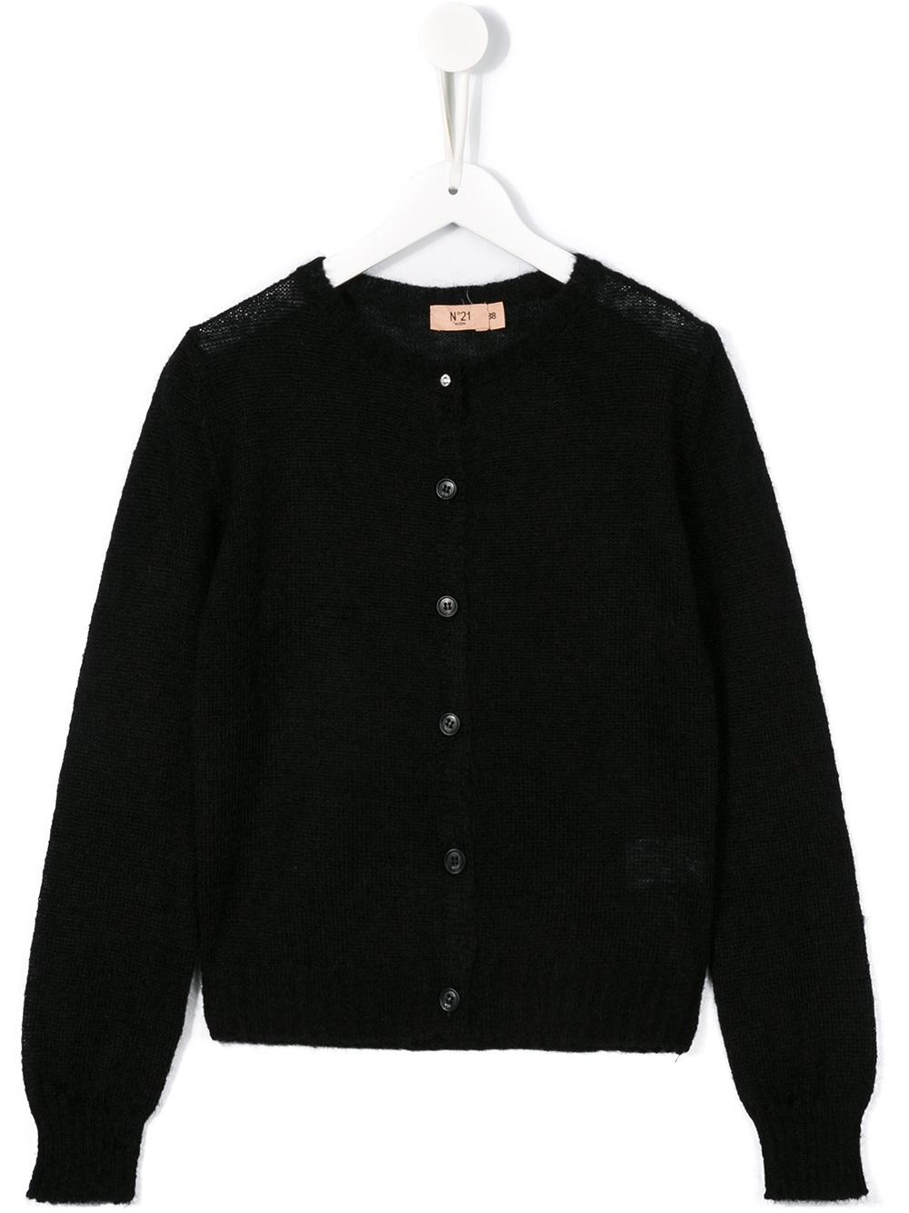 - Nº21 KIDS 黑色 羊毛 经典开衫。 圆领, 正面纽扣, 长袖, 罗纹底边及袖口。
