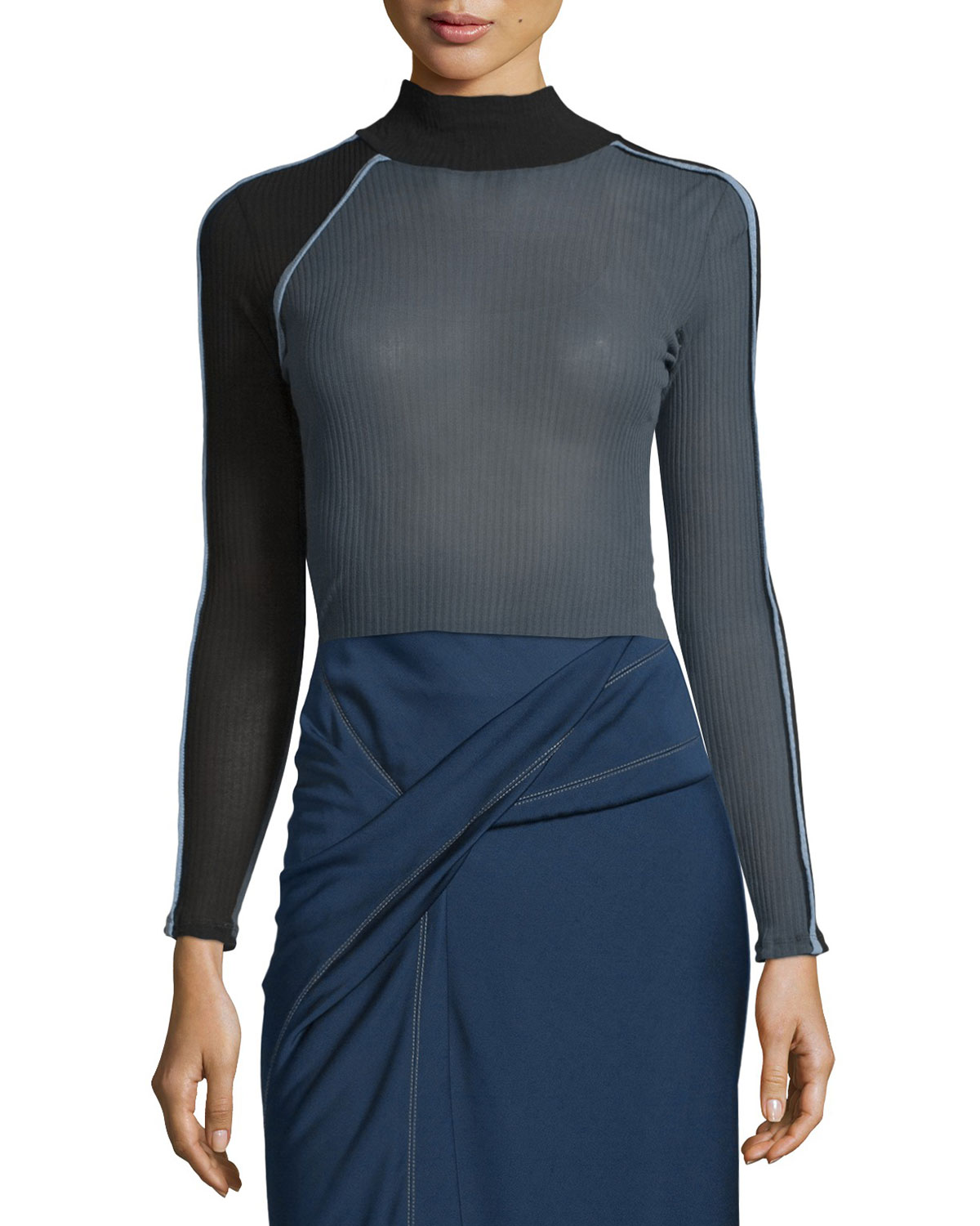 Ribbed Mock-Neck Long-Sleeve Sweater, Gray/Celeste/Black