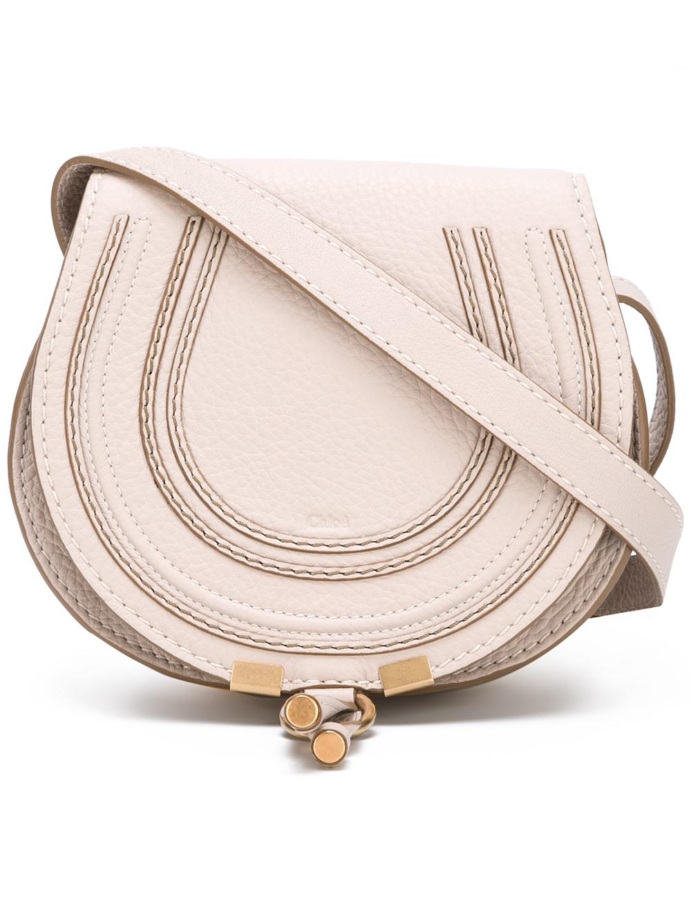 - Abstract white leather mini 'Marcie' round crossbody bag from Chloé featuring a foldover top, a pebbled leather texture, a front slip pocket, gold-tone hardware, a front embossed logo stamp, an adjustable shoulder strap, an internal patch pocket and an internal logo stamp.