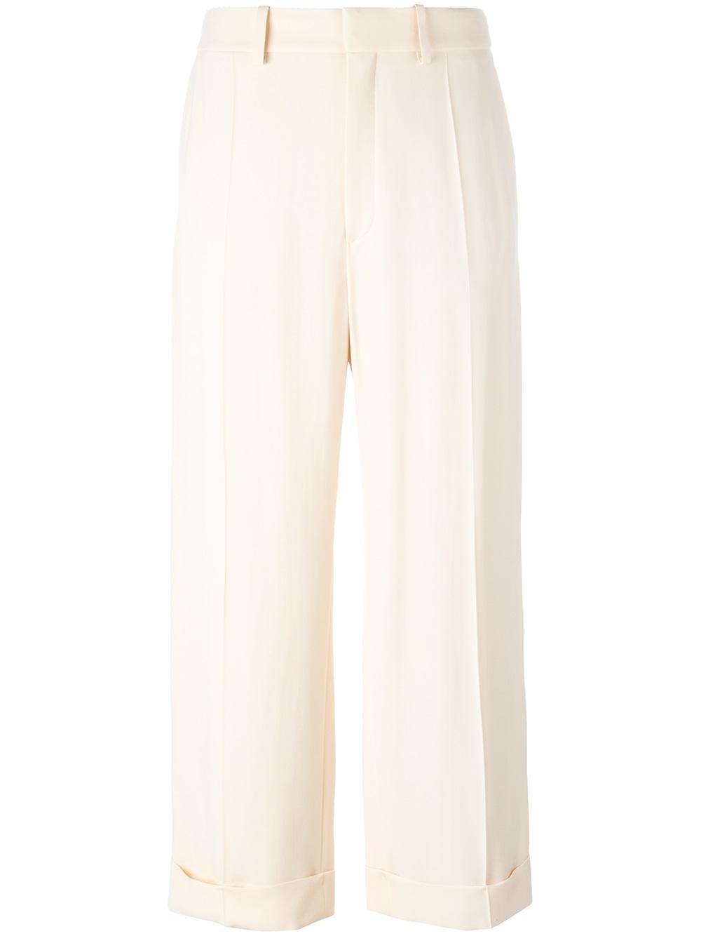 - Chloé (寇依) 米白色 丝绸混纺 九分西裤。 高腰, 钩与拉链, 腰带袢, 折痕, 两侧饰有内置口袋, 直筒腿, 下摆上翻, 后面有两个嵌线口袋。