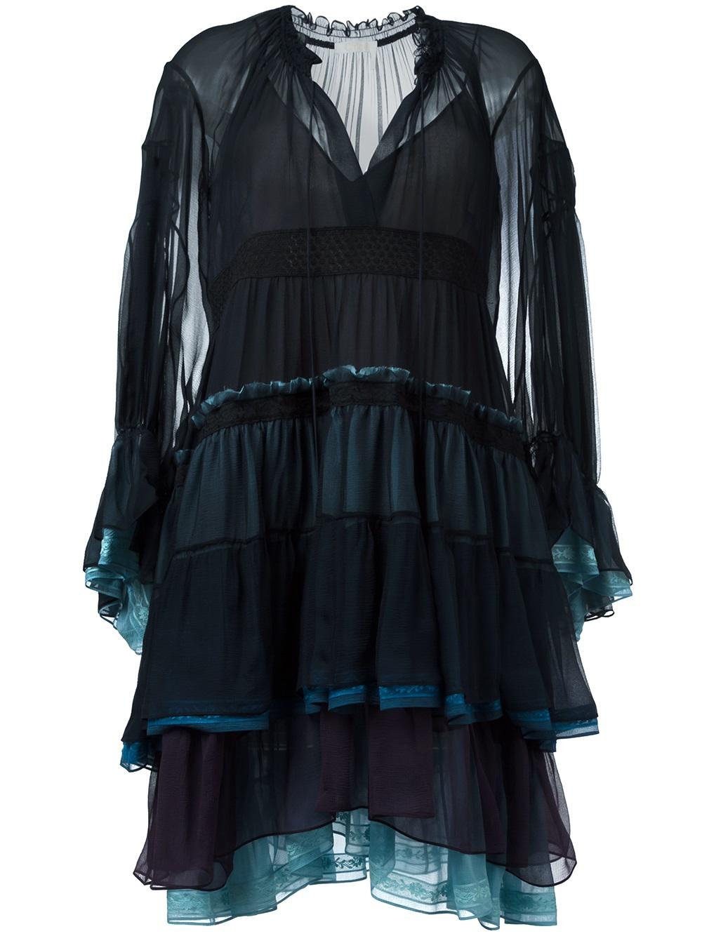 - When it comes to after-dark dressing nothing seduces like a fluid Chloé gown. Infused with an air of air of nonchalance the Chloé collection is not about stealing the spotlight but an innate sense of free-spirited attitude. This tiered colour block dress from Chloé is spun from a silk blend and features a split neck, a ruffle trim to the collar, frayed edges, billowing sleeves, a loose fit, a mid length and a lace trim. Complete this commanding look with a pair of stiletto sandals.