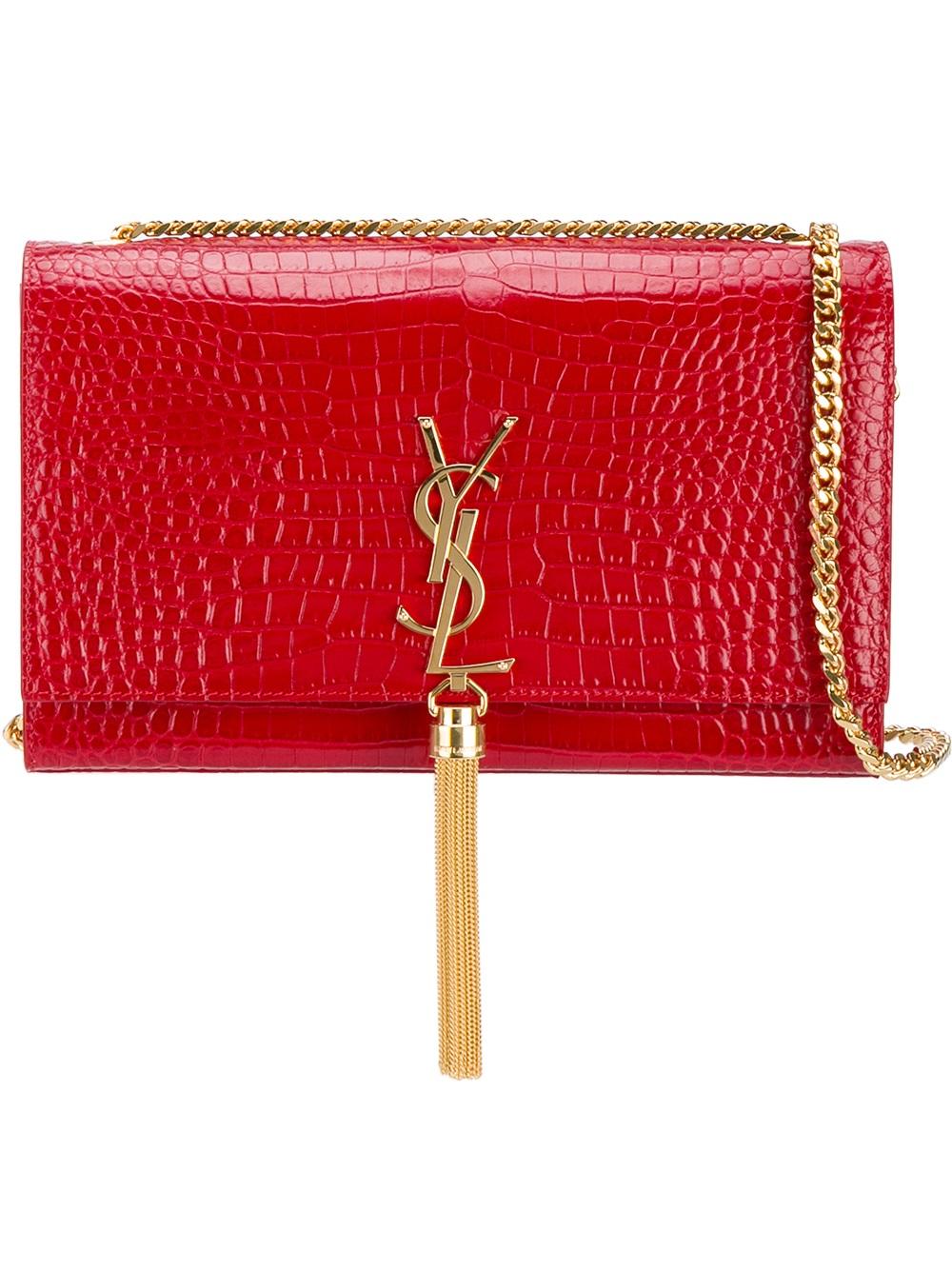 - Red leather 'Classic Monogram' shoulder bag from Saint Laurent featuring an embossed crocodile effect, a gold-tone logo plaque, a foldover top with magnetic closure, a hanging tassel, a gold-tone chain shoulder strap, an internal slip pocket and an internal logo patch.