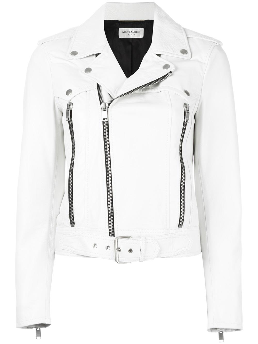 - Saint Laurent’s classic motorcycle jacket is all you’ll need to tap into the French fashion houses’ rock ‘n’ roll aesthetic for SS17. Expertly crafted in Italy from soft white lamb skin, it features a classic collar, shoulder epaulettes, an off-centre front zip fastening and long sleeves with zipped cuffs. Accented with silver-tone hardware, the front panel features two zip fastening pockets and a belted waist. Wear yours like the Saint Laurent catwalk by pairing with loose fit denim and a draped blouse.