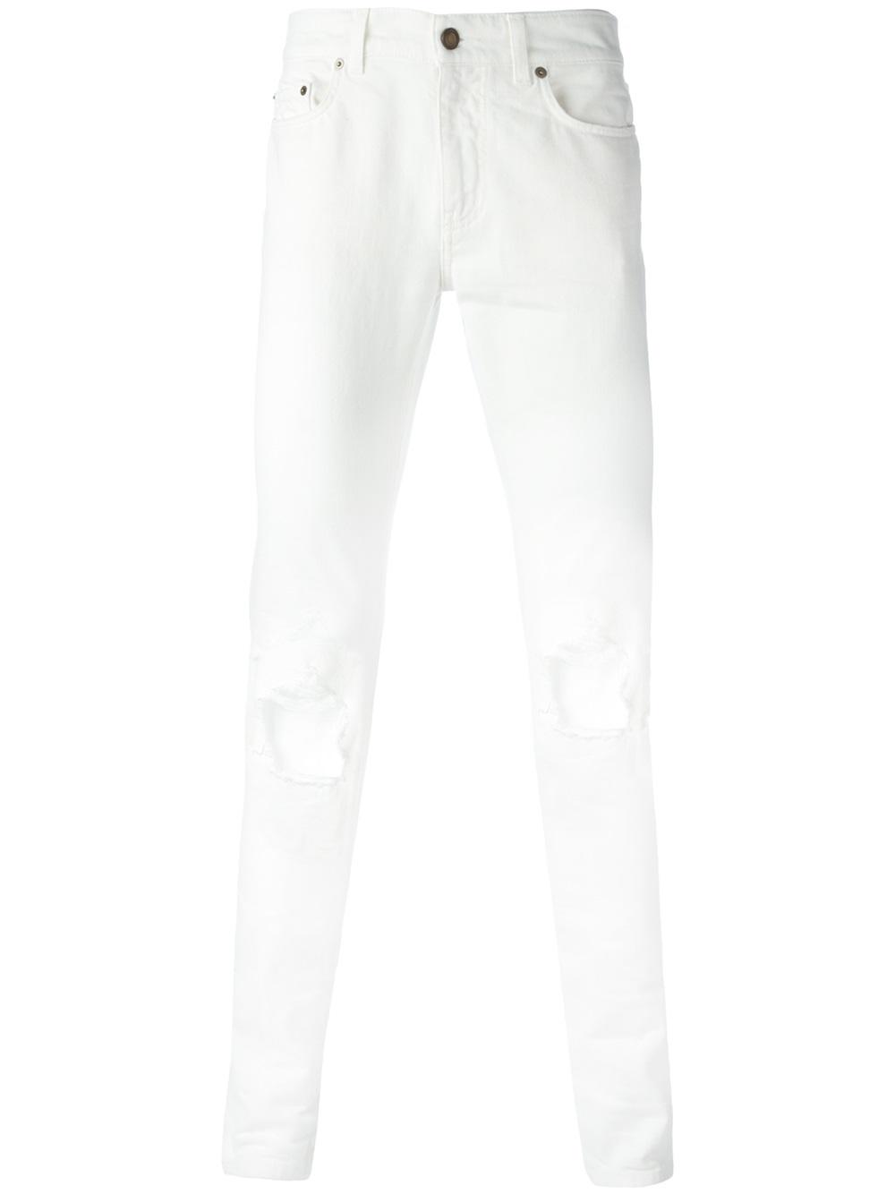 - Saint Laurent’s lauded denim is often considered the unsung hero of the French fashion house’s ready-to-wear collections. Presented in white cotton, this distressed-effect pair have been designed for a slim fit and feature holes at the knees for a pre-loved, lived-in aesthetic. Detailed with a low rise waistband, belt loops, a five pocket design, a button and zip front fastening and a regular length, pair yours with Saint Laurent’s Court Classic sneakers and a loose fit T-shirt.