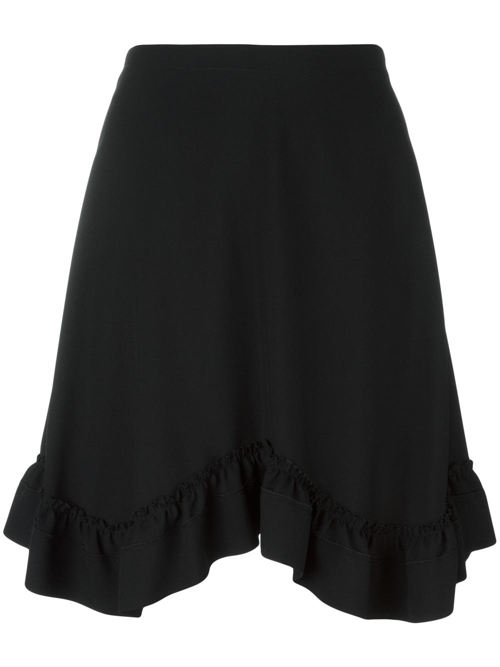 - A black ruffled skirt gives a cosy jumper a bohemian edge and nobody balances seventies glamour with off-duty cool quite like Chloé. Clare Weight Keller has elevated the maison with her distinctive British edge while re-establishing its reputation as a leader in luxury ready-to-wear. With up 60 people in the house atelier, craftsmanship is in the brand's DNA. Woven from a black silk blend this ruffled skirt features a short length and a distinctly Chloé asymmetric hem. It also features a discreet invisible back zip fastening.