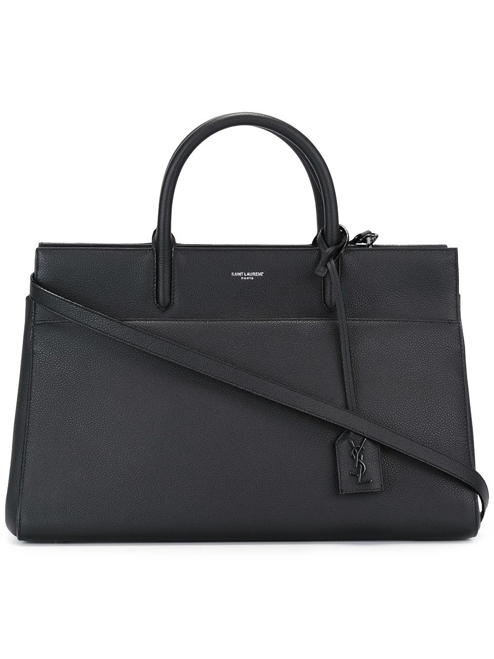- Saint Laurent’s Cabas Rive Gauche tote is characterized by its instantly recognisable trapeze silhouette and is presented here in the label’s medium size. Crafted from softly pebbled black leather, this Italian-made Cabas Rive Gauche tote is accented with tonal hardware and features two round top handles, a detachable shoulder strap, a central embossed logo and a front slip compartment. The spacious interior is ideal for carrying your on-the-go essentials benefits from a suede lining and internal zipped pocket.