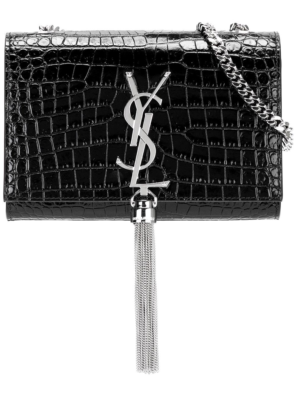 - For SS17, Saint Laurent continues to adorn its luxury leather goods with the label’s iconic and instantly recognisable YSL logo plaque. Presented in crocodile embossed calf leather, this Monogramme tassel chain wallet is the perfect accessory for day-to-night ensembles. Strung along a curb chain shoulder strap and accented with lustrous silver-tone hardware, this compact Saint Laurent design features a hanging central tassel, a magnetic front closure, a single internal slip pocket and a logo embossed internal plaque.