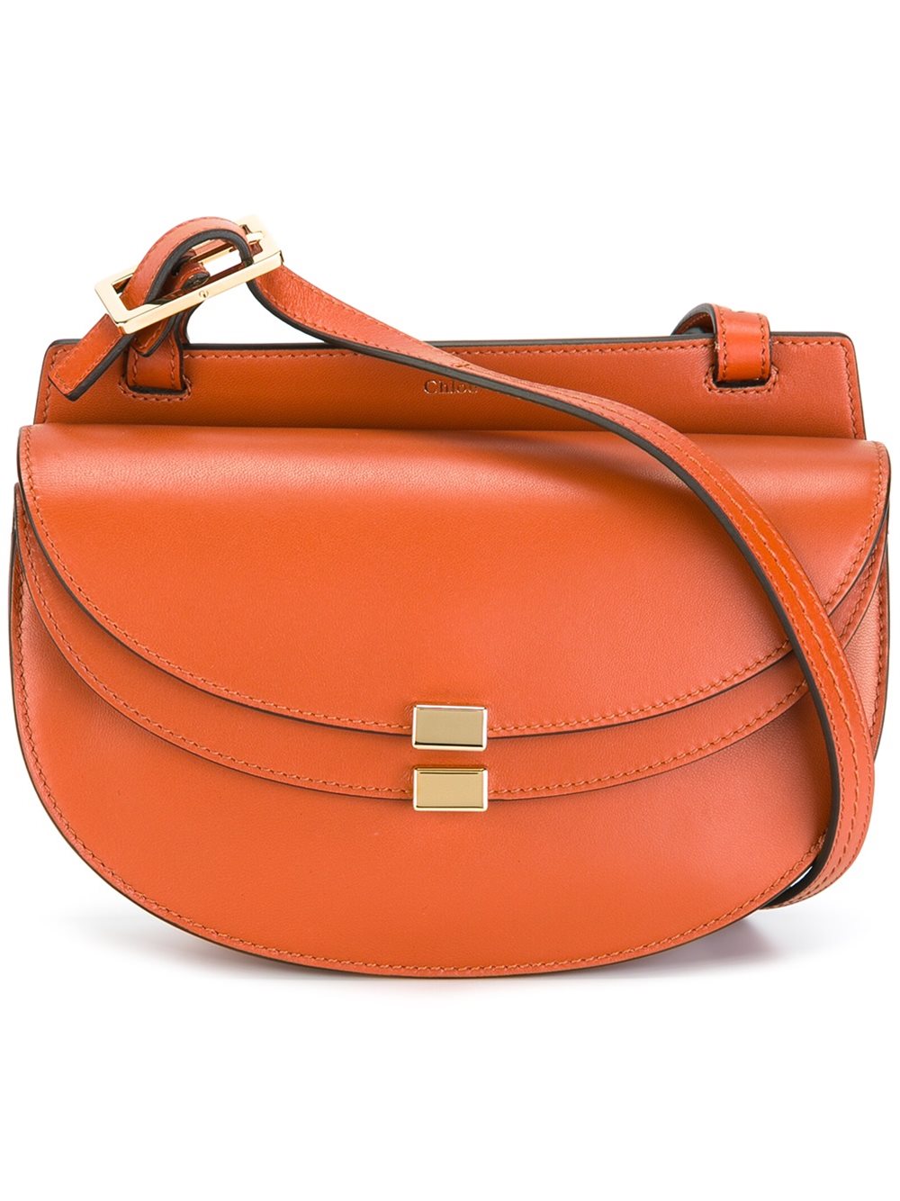 - Chloé (寇依) 橘色 小羊皮 'Georgia'单肩包。 翻盖饰有插入式的摁扣, 正面饰有浮雕品牌标记, 金色五金配件, 可调肩带, 绒面皮衬里。