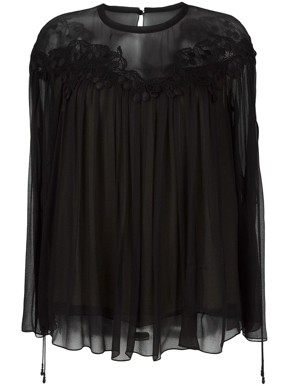 - Merging delicate silk with a defining sense of romanticism, this tiered blouse is an alluring addition to the Chloé ready to wear collection. Expertly balancing long slim silhouettes with ethereal layers that float around the body, Clare Weight Keller captures the laid back elegance of California for Resort 2017. Expect soft broderie anglaise, mannish separates and playful tropical fruit motifs. This black cherry guipure blouse from Chloé features a round neck, a sheer panel, a loose fit, long sheer sleeves, a rear keyhole detail and sleeve ties with tiny brass pineapples.