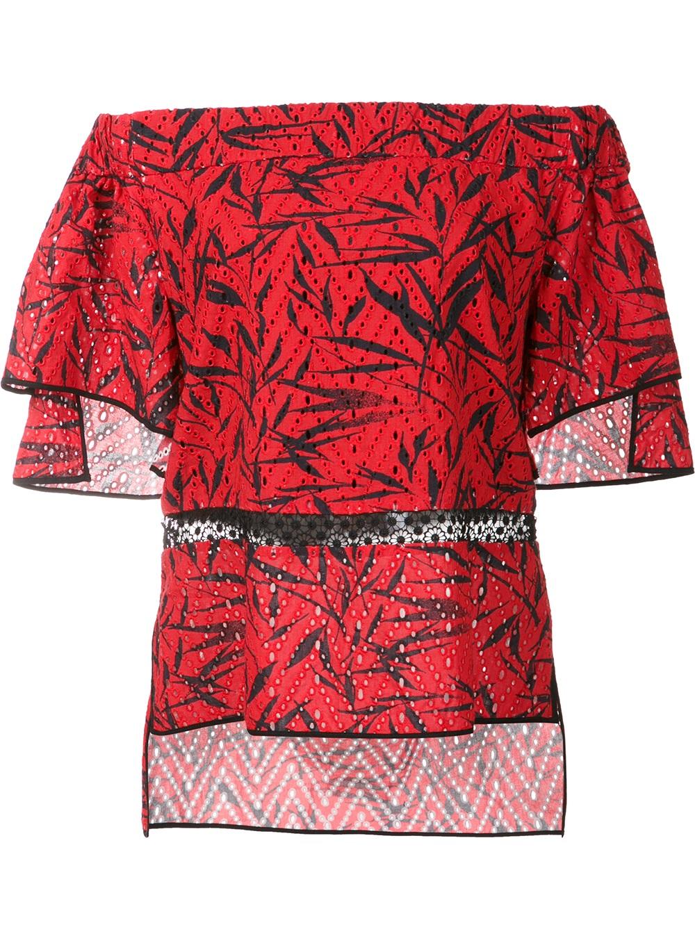 - Crimson red and black cotton off-shoulder tiered ruffle blouse from Prabal Gurung.