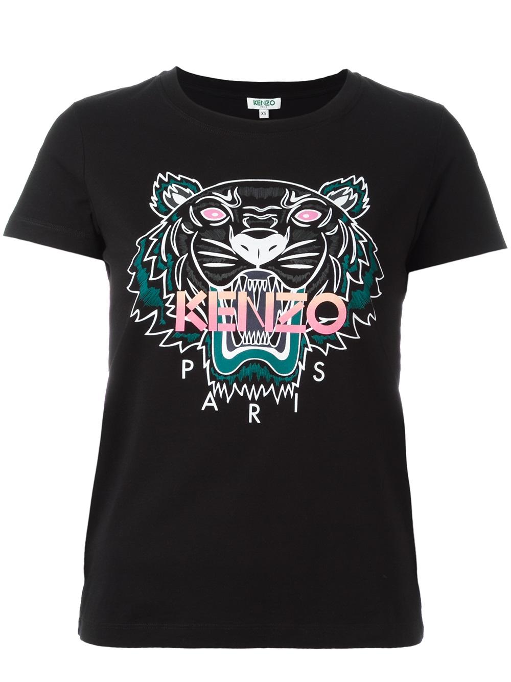 - Best known for their adventurous motifs and streetwear-inspired shapes, look to Kenzo to keep your casual wardrobe up to date. Printed with Kenzo's signature tiger motif, this black cotton T-shirt features a round neck and short sleeves.