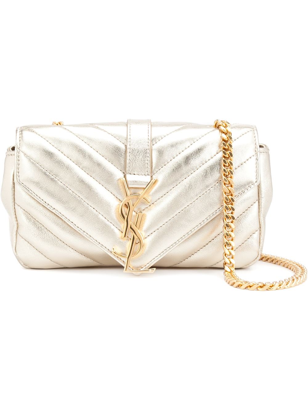 - Saint Laurent 金色 牛皮 'Monogram'迷你斜挎包。 翻盖饰有插入式的摁扣, 金色标牌, 金色铁链肩带, 绗缝效果, 后置贴袋, 内置多个分层。