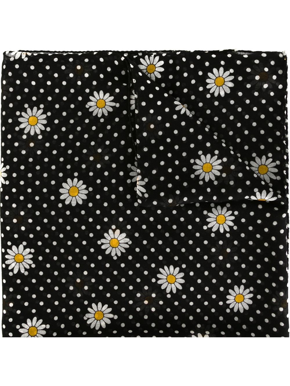 - Saint Laurent 黑色与多色 羊毛 雏菊印花围巾。 圆点印花, 平整收边。