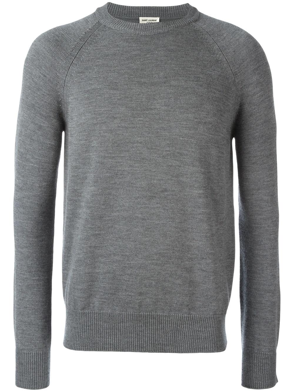 - Fashioned from soft virgin wool, Saint Laurent’s crew neck jumper is an instant classic. Made in Italy to the label’s exacting standards, this grey Saint Laurent jumper is finished with ribbed trims and long sleeves. Pair yours over a slim fit shirt and tailored trousers for a relaxed take on workweek dressing.